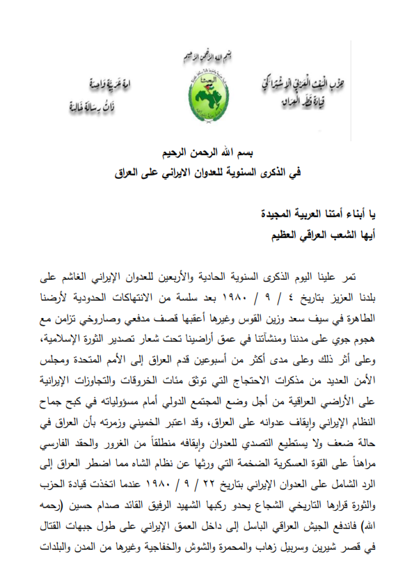 بيان قيادة قطر العراق في ذكرى العدوان لإيراني_001